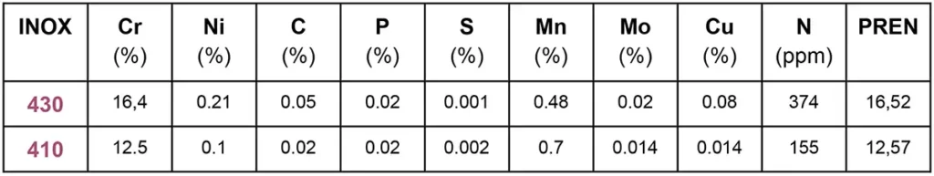 Na tabela 01 pode-se observar a diferença representativa de composição química entre os dois aços, chamando atenção na diferença de teor de cromo que reflete diretamente no PREN (Número equivalente de resistência ao pite). O cálculo é feito com base na composição química mostrando a superioridade causada pelo maior teor de cromo no 430.